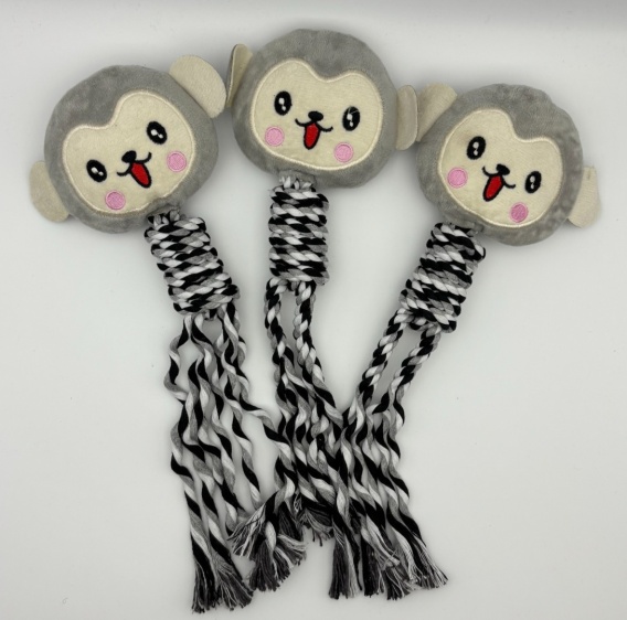 Zabawki wykonane są z miękkiego pluszu oraz bawełnianej liny, bez ostrych elementów — delikatne dla pyska psa.