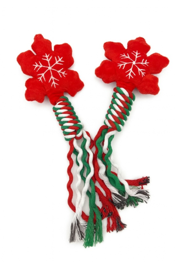 Podaruj swojemu psu wyjątkową świąteczną radość! Urocza zabawka w kształcie czerwonego płatka śniegu z haftem, połączona z mocnym, plecionym sznurem w świątecznych kolorach, to gwarancja długiej, pełnej emocji zabawy.